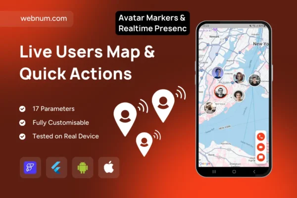 live location, realtime map, avatar markers, users tracker, Google Maps, Mapbox, clustering, geofencing, ETA, routes, quick actions, WebSocket, Firestore, Flutter, FlutterFlow, background location, privacy, presence.
