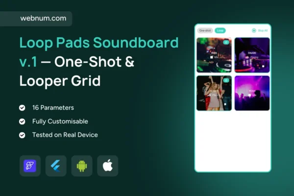 Keywords: FlutterFlow soundboard, loop pads, drum pads UI, one-shot mode, loop mode, Stop All, per-pad loop, per-pad stop, sample trigger, audio sampler, SFX board, beat maker UI, pad controller, grid player, music app UI, podcast soundboard, DJ tools, interactive audio, mobile DAW, just_audio integration, audio service, Firestore assets, Supabase storage, Cloud Storage, responsive grid, rounded cards, status labels, playing indicator, minimal design, clean UI, Flutter widget, premium template, tap feedback, performance ready, layered playback, media controls, FlutterFlow component.