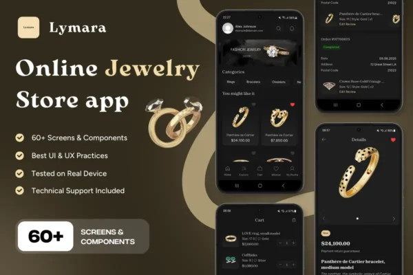 Lymara is an elegant and modern FlutterFlow jewelry store app template designed to help you launch a premium online shopping experience for luxury accessories and fine jewelry. With its polished black-and-gold aesthetic, intuitive navigation, and 60+ ready-to-use screens, Lymara is the perfect foundation for brands seeking sophistication and performance.