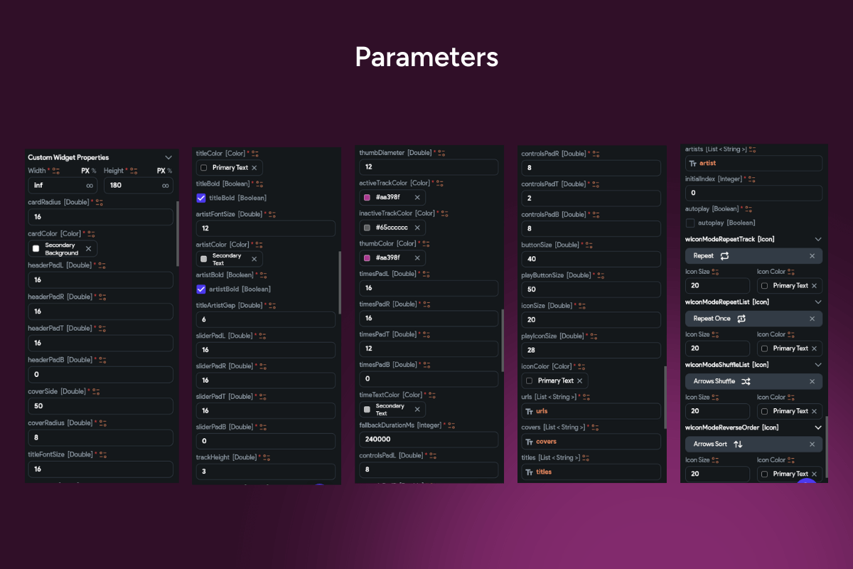Keywords: FlutterFlow audio player, card player, mini player, playlist sheet, bottom sheet queue, queue button, seekbar, progress bar, draggable thumb, play pause, previous next, repeat toggle, shuffle toggle, time labels, negative remaining time, album artwork, title artist, rounded card, soft shadow, responsive layout, clean UI, mobile media player, just_audio integration, audio service, Firestore binding, Supabase storage, REST datasource, active track indicator, swipe to dismiss, drag handle, modern UX, premium template, Flutter widget, FlutterFlow component, dark mode, light theme.