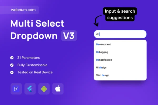 A clean, fast autocomplete field that shows real-time suggestions as users type. Matching terms are highlighted inside each result, with keyboard navigation, debounced queries, and async data support. Designed for accuracy and speed across mobile and web.