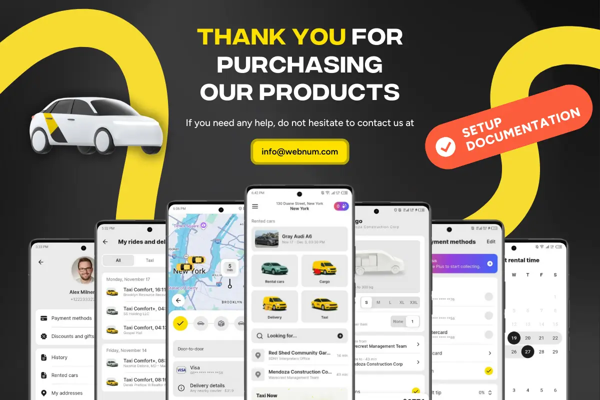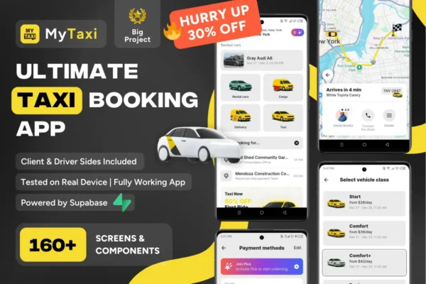Keywords: taxi booking app template, ride hailing app template, taxi app UI kit, Uber clone app template, Bolt clone app UI, cab booking app UI, ride request screens, pickup dropoff flow, real-time map tracking, live driver location, rider tracking map, route and ETA UI, fare estimate UI, vehicle selection UI, ride scheduling feature, scheduled ride booking, delivery and cargo options, parcel delivery booking, courier delivery flow, multi-service transport app, driver profile screens, driver ratings UI, passenger profile screens, ride history UI, trip details screens, in-app real-time chat, rider driver chat system, safety features module, SOS button UI, emergency support screens, customer support module, help center screens, app notifications UI, settings screens UI, promo and discounts UI, wallet and payments UI, location services app, maps integration UI, smooth performance animations, premium UI UX design, scalable architecture, modular project structure, backend logic integration, production-ready template, ready-to-ship UI, 160+ screens and components, 26 custom widgets, save 250+ development hours, iOS taxi app UI, Android ride hailing UI, tablet responsive layouts, web-ready layouts, FlutterFlow, Flutter, FlutterFlow template, FlutterFlow taxi app, FlutterFlow maps, Flutter ride hailing app, Flutter taxi booking app, Webnum, Webnum templates, Webnum FlutterFlow, Webnum app template, no-code taxi app builder, low-code ride hailing template