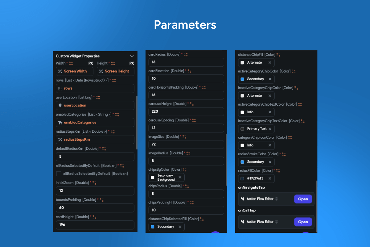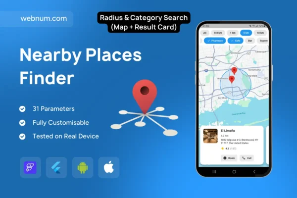 nearby search, radius filter, category chips, geofencing, Google Maps, place details, route CTA, call CTA, location discovery, store locator.