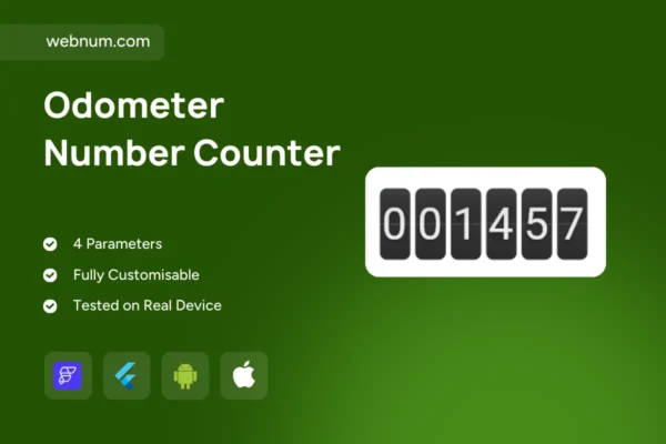 Keywords: odometer counter, timer, countdown timer, rolling digits, flip counter, number ticker, animated counter, KPI widget, statistic display, visitor count, sales counter, donations counter, download count, count up, count down, carry over, leading zeros, monospaced numerals, thousands separator, prefix suffix, currency format, progress metric, real time value, Firestore binding, Supabase integration, REST API, GPU accelerated, haptic feedback, milestone events, dark mode, light mode, RTL support, accessibility, responsive UI, Flutter widget, FlutterFlow component, dashboard metric, ecommerce KPI, modern design.
