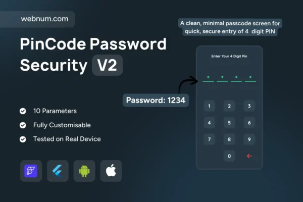 pin pad, passcode entry, numeric keypad, 4-digit pin, 6-digit pin, masked input, underline slots, auto advance, auto submit, backspace key, error shake, haptic feedback, lockout timer, cooldown, forgot pin, biometric fallback, Face ID, Touch ID, secure storage, hash pin, otp autofill, paste detection, accessibility labels, dark theme, rounded buttons, responsive ui, mobile auth, web auth, session reauth, payment confirmation, wallet security, fintech ui, kiosk mode, localization, theming controls, Flutter widget, FlutterFlow component, modern authentication, premium styling.