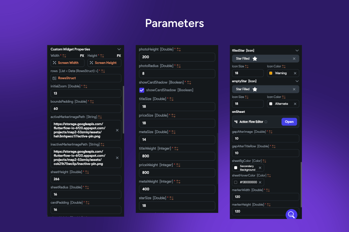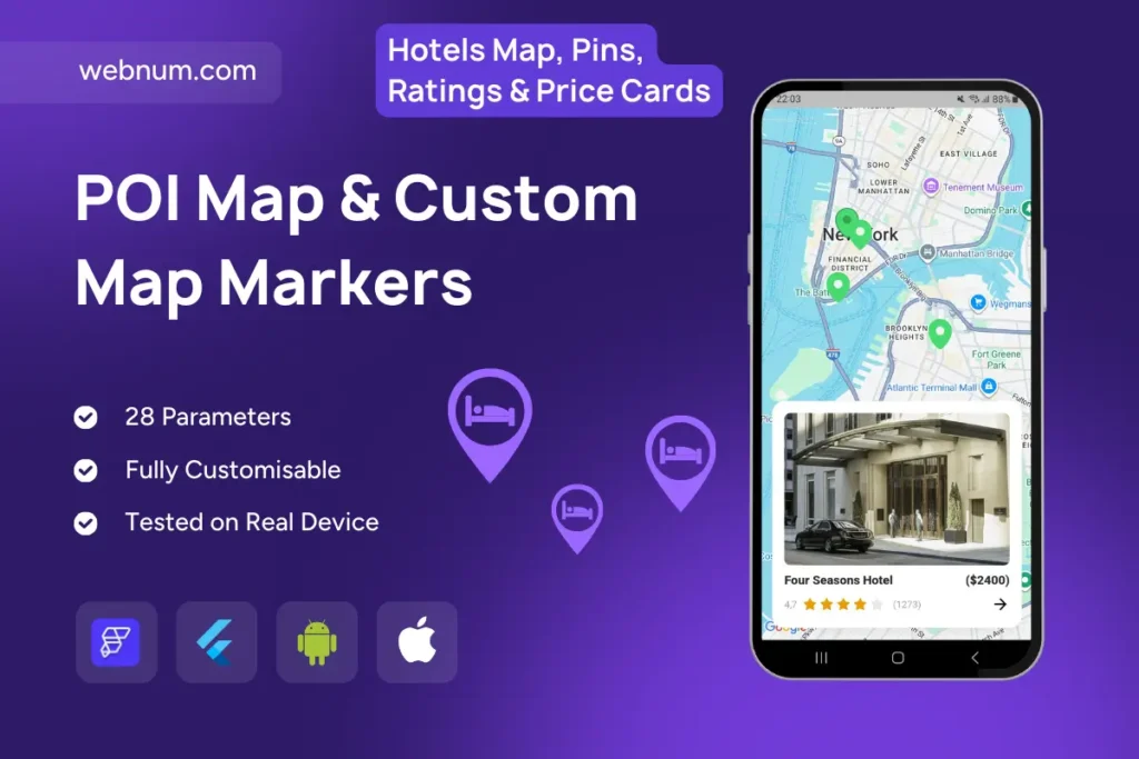 An interactive places explorer that pairs a multi-marker map with a draggable, snap-to states bottom sheet. Tapping a pin (hotel, restaurant, store, etc.) reveals a rich card with photo, name, rating, review count, price and a primary CTA. Swiping the sheet (or a cards carousel) re-centers the map and highlights the corresponding marker. Fully themable and data-driven, it supports custom marker icons, clustering, category filters, and deep links to full place pages.