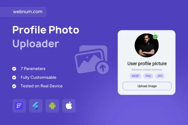 A friendly, conversion-focused avatar upload card with a clear title, allowed-format chips (WEBP/PNG/JPG), and a prominent Upload image button. Perfect for onboarding and profile settings—simple out of the box, yet fully extensible with previews, cropping, and cloud storage.