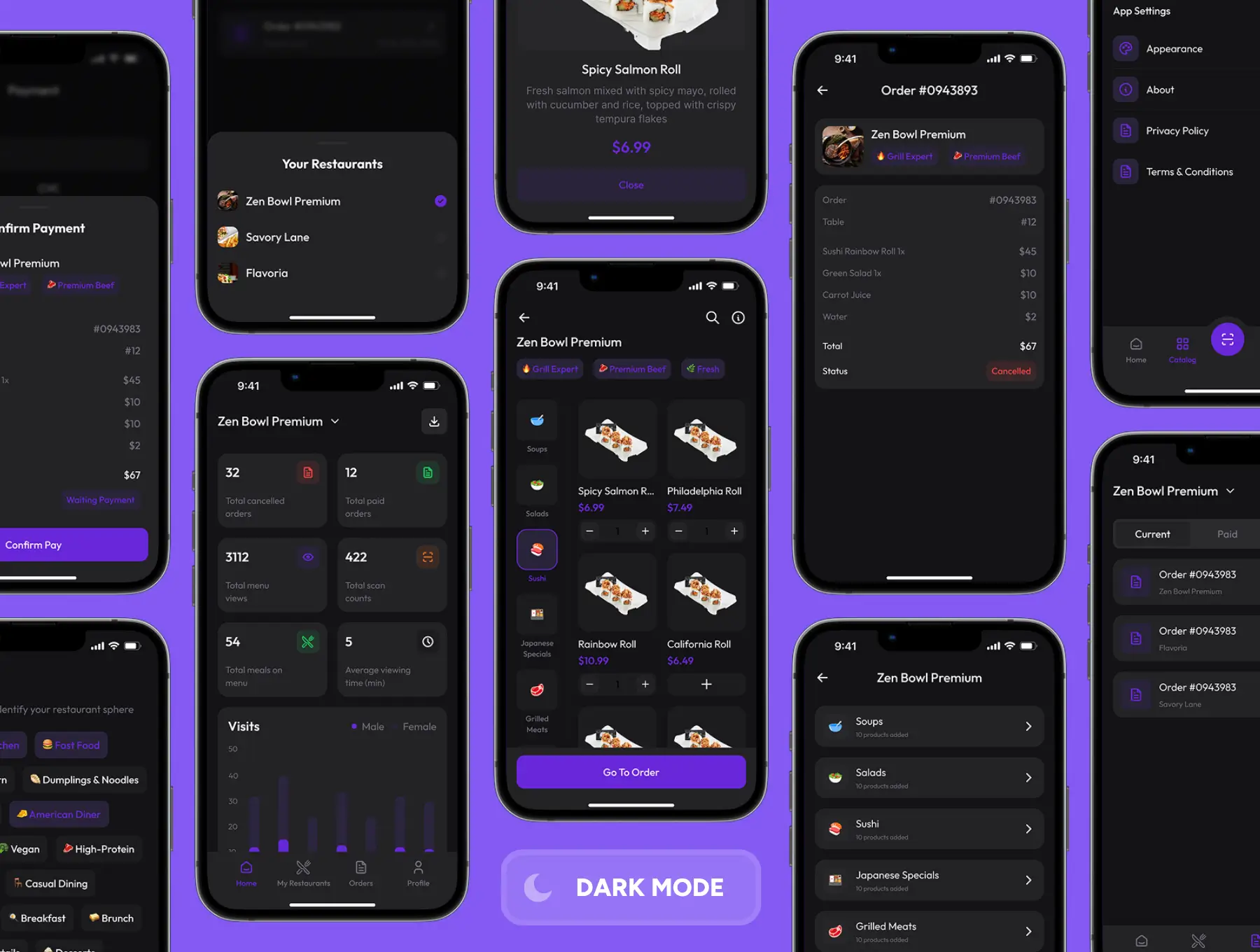 Serve a smoother contactless dining experience — fast. QR-Powered Restaurant Menu is a production-ready restaurant menu UI kit for Figma with Dark & Light themes, a full design system, and 130+ polished screens for both customer and restaurant sides. Scan a QR, browse dishes, customize, order, pay, track status, and manage the menu — all with one consistent UI that rebrands in minutes.