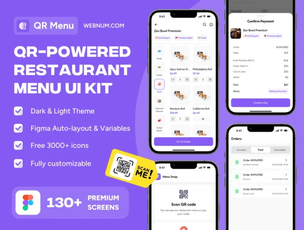 Serve a smoother contactless dining experience — fast. QR-Powered Restaurant Menu is a production-ready restaurant menu UI kit for Figma with Dark & Light themes, a full design system, and 130+ polished screens for both customer and restaurant sides. Scan a QR, browse dishes, customize, order, pay, track status, and manage the menu — all with one consistent UI that rebrands in minutes.