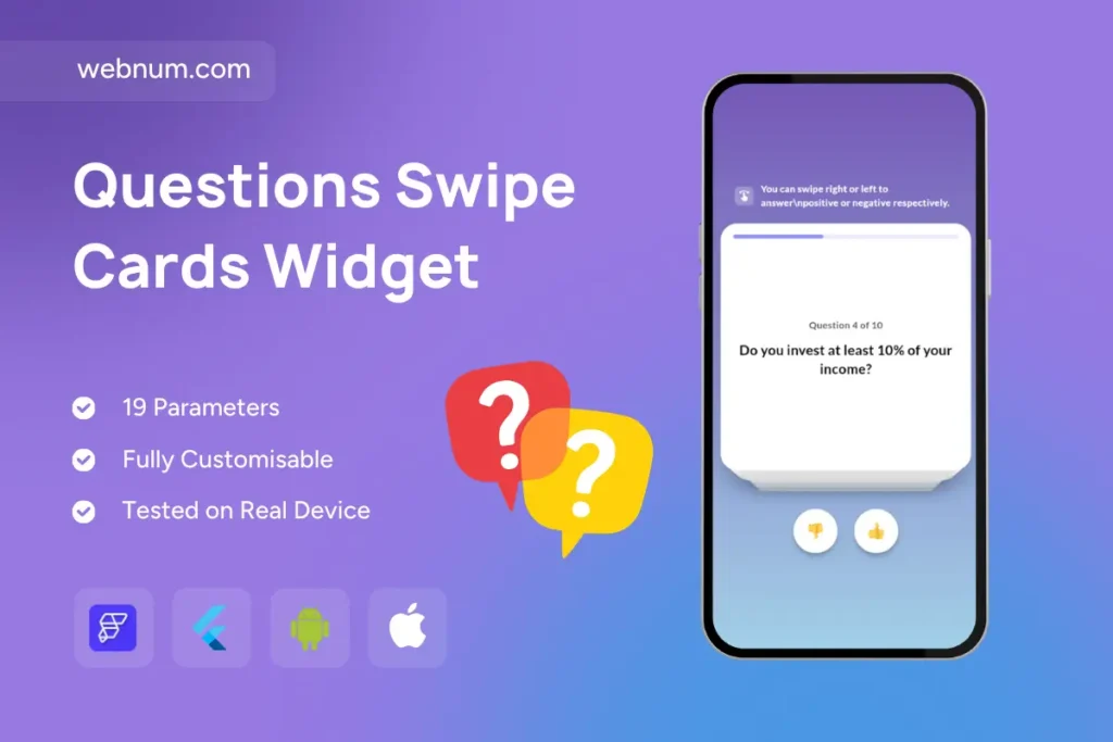 Keywords swipe quiz, card survey, binary questions, thumbs up/down, gesture UI, stacked cards, gamified assessment, progressive disclosure, branching logic, scoring, analytics, onboarding questionnaire, mobile survey UX.