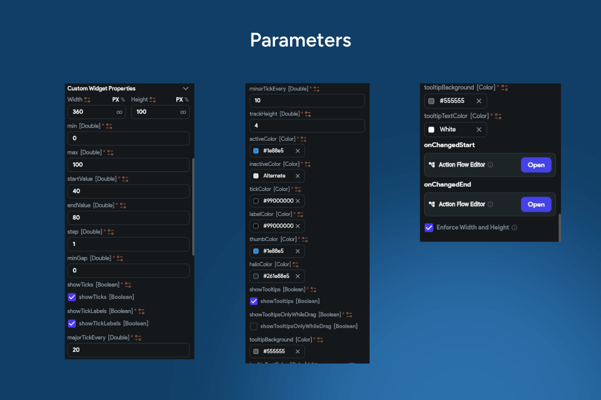 Keywords: range slider, dual handle slider, min max slider, tick marks, tooltip slider, numeric tooltip, step size, snap to step, active track, ripple feedback, RTL support, keyboard control, accessible slider, high contrast, determinate control, filter UI, interval selector, threshold control, price filter, value range, FlutterFlow slider, Flutter widget, theming, track thickness, handle radius, tooltip formatting, currency format, data binding, Firestore integration, Supabase integration, REST API, responsive design, read-only state, disabled state, onChange callback, onEnd callback, UI component, modern design, premium template, mobile web.