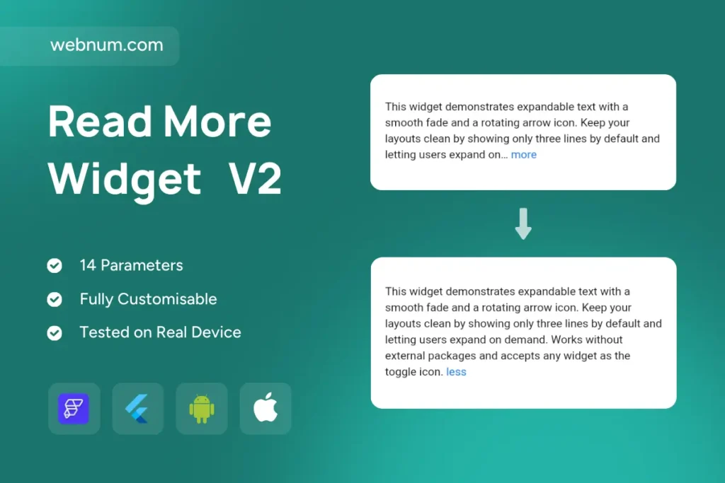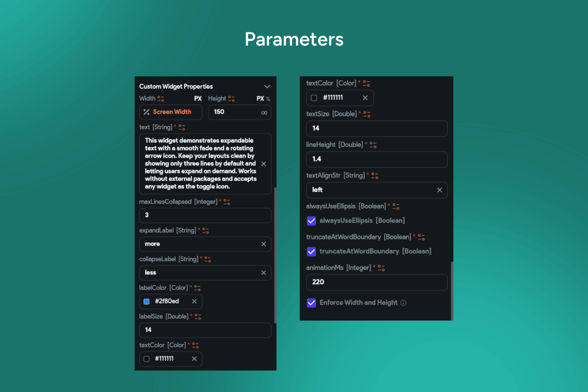 read more, show more, expandable text, collapsible text, line clamp, ellipsis, inline link, more/less, animated height, accessibility, localization, theming, rich text, markdown, list virtualization, mobile UI, Flutter widget, FlutterFlow component.