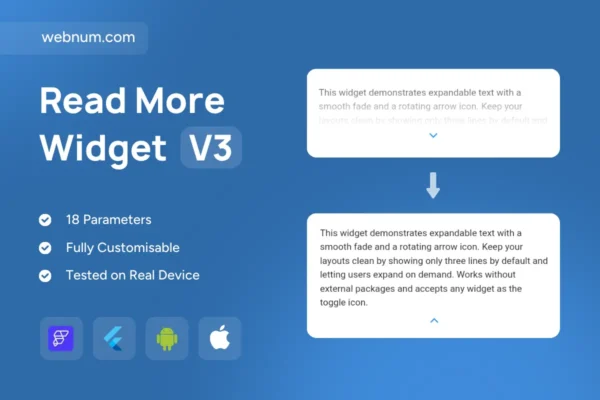 read more, expandable text, collapsible, line clamp, ellipsis, fade overlay, center chevron, rotating arrow, animated expand, scroll retention, accessibility, localization, theming, Markdown, list virtualization, Flutter widget, FlutterFlow component, mobile UI.