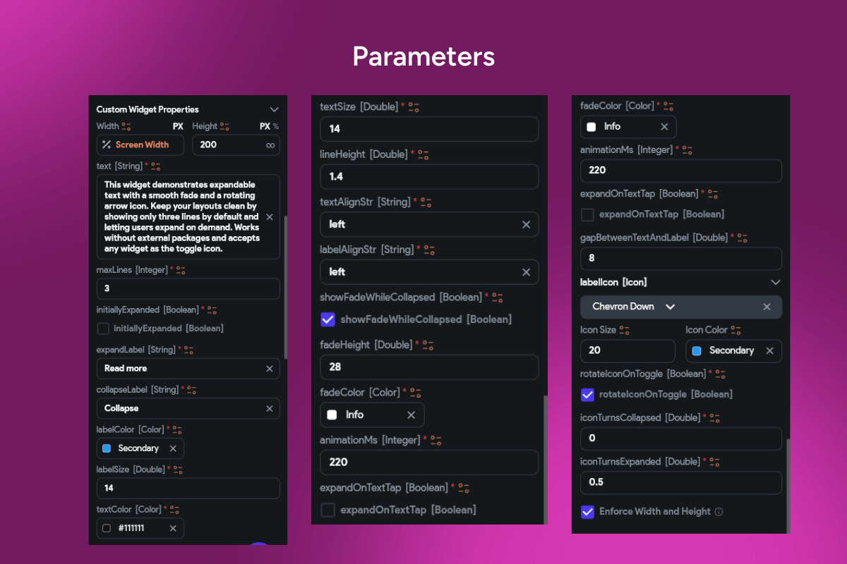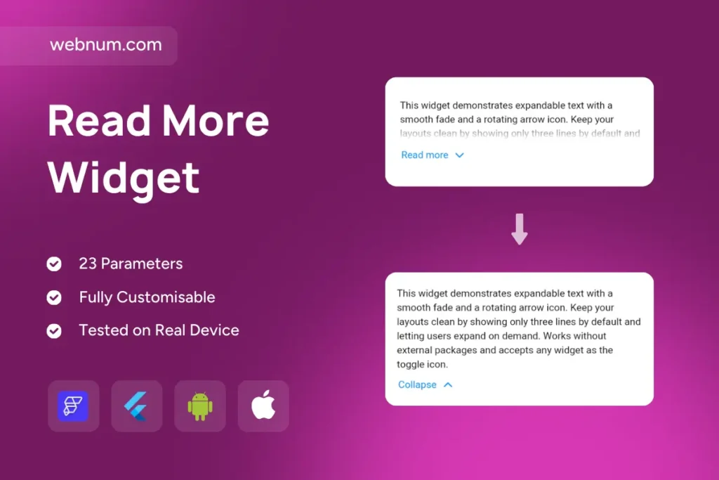 read more, expandable text, show more, collapsible section, line clamp, truncation, ellipsis, fade, rotating arrow, animated height, accessible, localization, theming, rich text, markdown, list virtualization, Flutter widget, FlutterFlow component, UX pattern, content reveal.