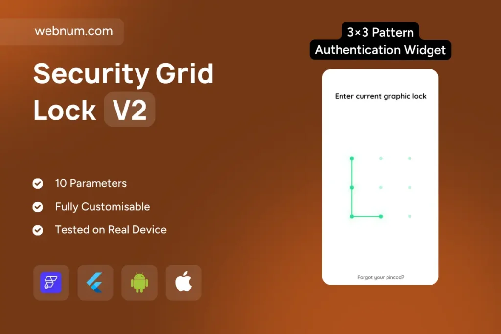 pattern lock, gesture lock, grid lock, 3×3 pattern, 4×4 pattern, 5×5 pattern, glowing nodes, trail animation, gradient stroke, stealth mode, error shake, haptic feedback, cooldown timer, lockout, forgot pincode, biometric fallback, Face ID, Touch ID, secure storage, keychain, keystore, salted hash, verification flow, set/confirm pattern, accessibility labels, localization, responsive layout, privacy screen, mobile security UI, app lock, authentication, login screen, Flutter widget, FlutterFlow component, lightweight UI, modern design, premium styling.