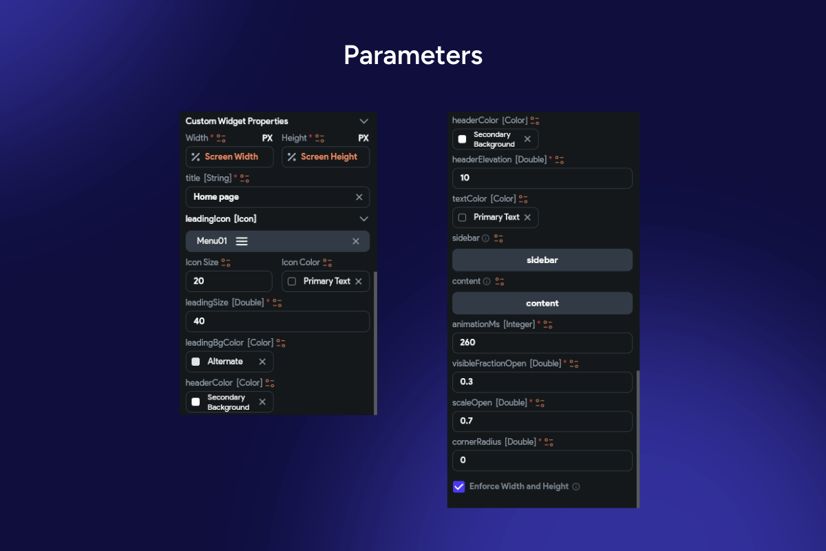 sidebar, navigation drawer, modal drawer, hamburger menu, slide-in menu, navigation rail, collapsible menu, nested navigation, scrim, backdrop blur, active state, badges, responsive UI, safe area, accessibility, Flutter widget, FlutterFlow component, mobile navigation, tablet layout, admin dashboard.