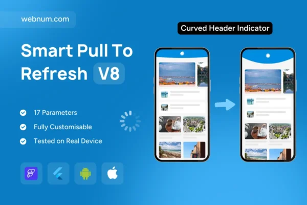 pull to refresh, elastic wave, curved header, liquid indicator, wave morph, overscroll, refresh control, loading spinner, success checkmark, last updated label, programmatic refresh, single flight, debounce, throttle, timeout, safe area, notch aware, slivers, list view, grid view, nested scroll, infinite scroll compatible, optimistic UI, SWR pattern, cache then network, haptic feedback, reduce motion, accessibility, localization, RTL support, dark mode, theming, 60fps, smooth animation, Flutter widget, FlutterFlow component, mobile web, high performance, modern UI.