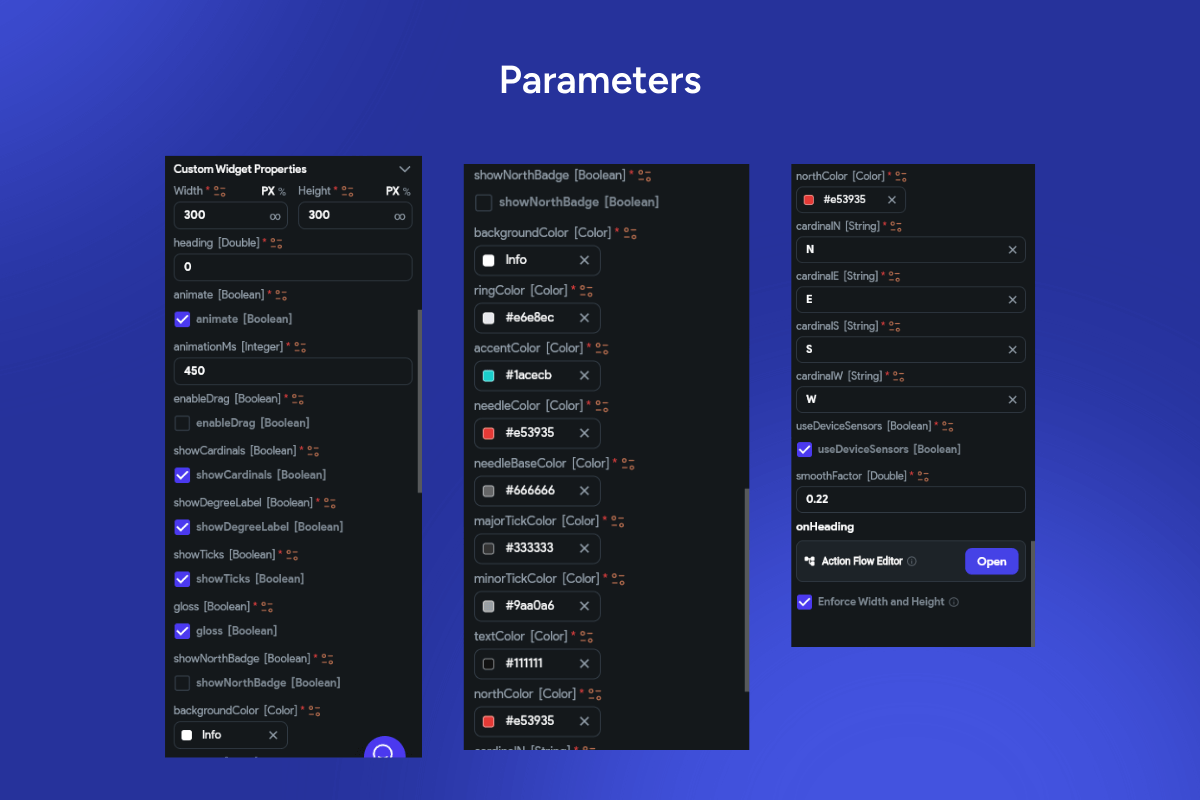 compass, heading, bearing, azimuth, cardinal directions, dial, gauge, animated needle, degree label, tick marks, north badge, theming, gloss, ring color, accent color, magnetometer, gyroscope, orientation, navigation UI, Flutter widget, FlutterFlow component, high performance, 60fps, dark mode.