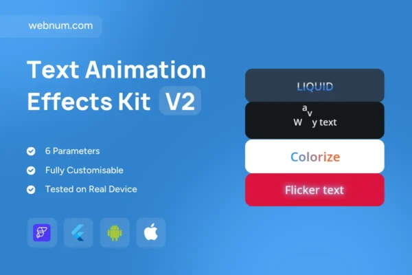 Bring headlines and microcopy to life with a set of GPU-smooth text animations: liquid displacement, sine-wave wobble, rainbow color cycling, and cinema-style flicker. Designed for mobile and web, fully tunable, and accessible by default.