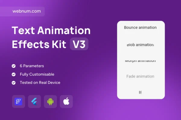 Polished, high-performance text animations for modern apps. This kit adds four expressive effects—Bounce, Blob, Morph, and Flip—to elevate headlines, buttons, list items, and micro-interactions without sacrificing accessibility or performance.