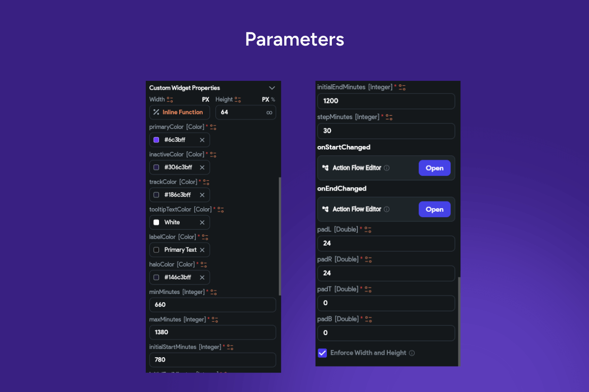 Keywords: time range slider, schedule picker, start end time, dual handle slider, time selector, hourly slider, tick marks, tooltip time, AM PM, 12 hour format, 24 hour format, timezone aware, blackout intervals, min max time, step minutes, snap to step, active track, ripple feedback, keyboard control, RTL support, accessible slider, responsive UI, booking window, delivery slot, quiet hours, working hours, availability picker, FlutterFlow slider, Flutter widget, theming, data binding, Firestore, Supabase, REST API, modern UI, premium template.