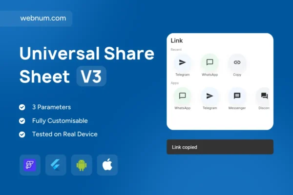 Lightweight, native share dialog that leverages Android’s intent picker to distribute a link in one tap. Shows recent targets first (e.g., Email, WhatsApp, Telegram), keeps your UI minimal, and feels 100% system-native with no extra dependencies.