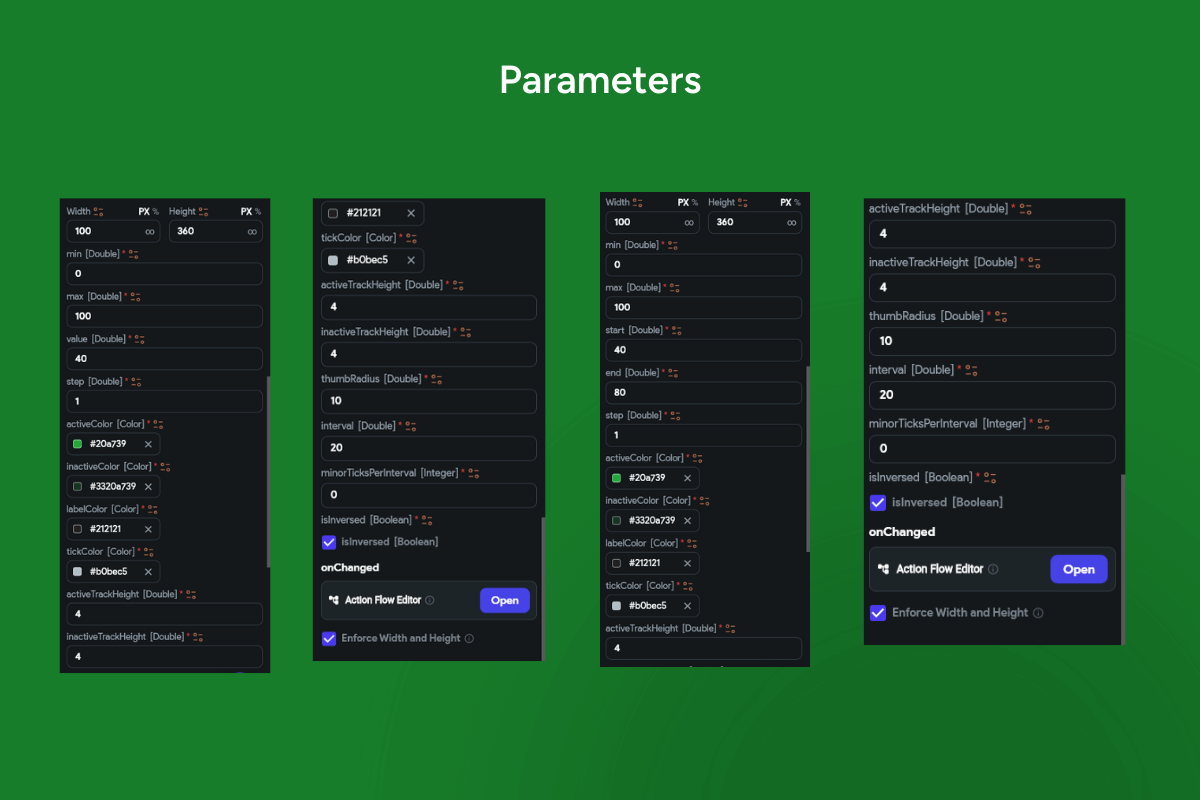 Keywords: FlutterFlow slider, vertical slider, range slider, dual handle slider, single value slider, min max control, tick marks, labeled scale, divisions, step size, snap to step, active track, inactive track, ripple feedback, keyboard control, Up Down keys, PageUp PageDown, RTL support, accessible slider, high contrast, theming, track thickness, handle radius, tick density, numeric labels, percentage slider, audio level, volume slider, temperature slider, threshold picker, filter UI, responsive layout, data binding, Firestore integration, Supabase integration, REST API, onChange callback, onEnd callback, disabled state, read-only state, modern UI, smooth animation, mobile web, Flutter widget, FlutterFlow component.