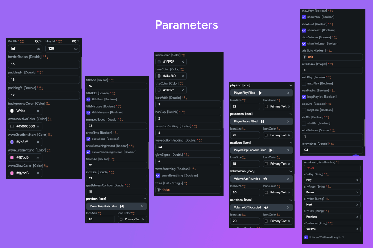 Keywords: FlutterFlow audio player, waveform player, mini player, compact audio card, inline audio, animated waveform, waveform seek, progress bar, play pause, previous next, volume control, mute toggle, time label, duration display, track title, ellipsis truncation, rounded corners, soft shadow, gradient accent, minimal UI, clean design, mobile media player, podcast preview, song preview, just_audio integration, audio service, Firestore binding, Supabase storage, REST datasource, Flutter widget, responsive layout, light theme, dark theme, media controls, premium template, small footprint, modern UI, FlutterFlow component.