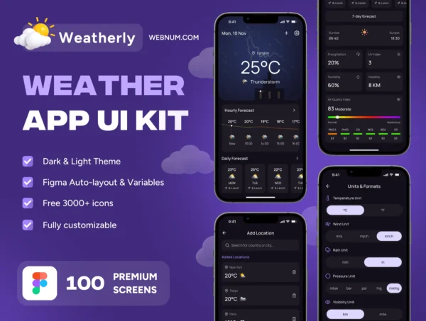 Launch a premium weather or climate companion app without designing every screen from scratch. Weatherly is a production-ready Weather App UI Kit for Figma — crafted for beautiful forecasts, rich climate insights, and configurable alerts. It ships with Dark & Light themes, a complete design system, and 100+ polished screens that cover everything from multi-city dashboards and AQI to units, notifications, and subscriptions.